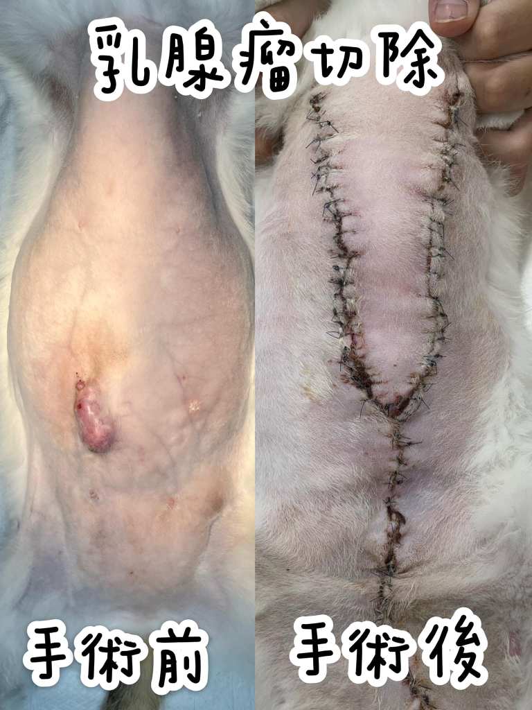 最近醫院也來了一隻乳腺瘤的貓咪,在進行乳腺外科切除術及術後的悉心照護後恢復良好!各位飼主應隨時注意家中寶貝的狀況,若發現身上有發現不明腫塊應立刻帶至動物醫院進行檢查!越早進行處理治療,康復機率越大呦![]()