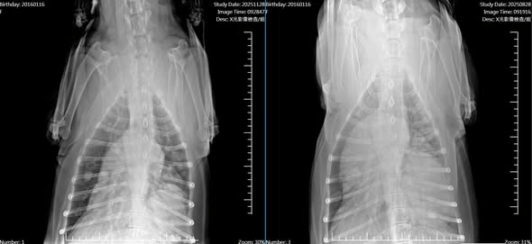 經由萌寵醫療團隊進行詳細的高階影像檢查後,我們在 X 光片上發現了令人心痛的真相:寶貝的肺部被一個巨大的高密度團塊佔據,嚴重壓縮了正常的肺葉空間,這也是他日夜咳嗽、無法安睡的主因。